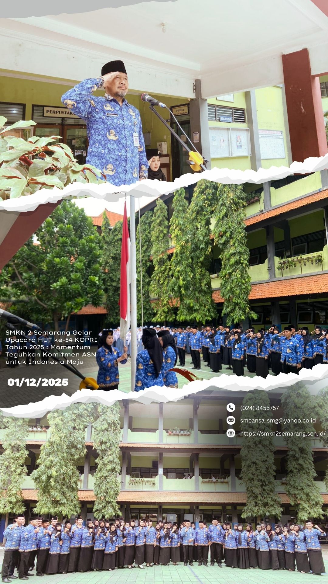 Kepala SMKN 2 Semarang, Bapak Nana Mulyana, S.P, M.Si. bertindak sebagai Pembina Upacara. Dalam amanatnya, beliau membacakan sambutan Ketua Umum Dewan Pengurus KORPRI Nasional, Prof. Dr. Zudan Arif Fakrulloh, SH, MH. Dalam sambutan yang dibacakan, disampaikan tema peringatan HUT KORPRI ke-54 tahun 2025 yang mencerminkan tekad Aparatur Sipil Negara (ASN) untuk tetap menjaga persatuan, solid, berintegritas dan mandiri dalam pengabdian, menjadi kekuatan moral dan professional, menjadikan KOPRI sebagai kekuatan pemersatu dan penggerak birokrasi demi terwujudnya Indonesia yang maju, adil, berdaya saing, dan berkeadilan, dengan semangat memperkuat solidaritas dan persatuan diantara anggota KORPRI.