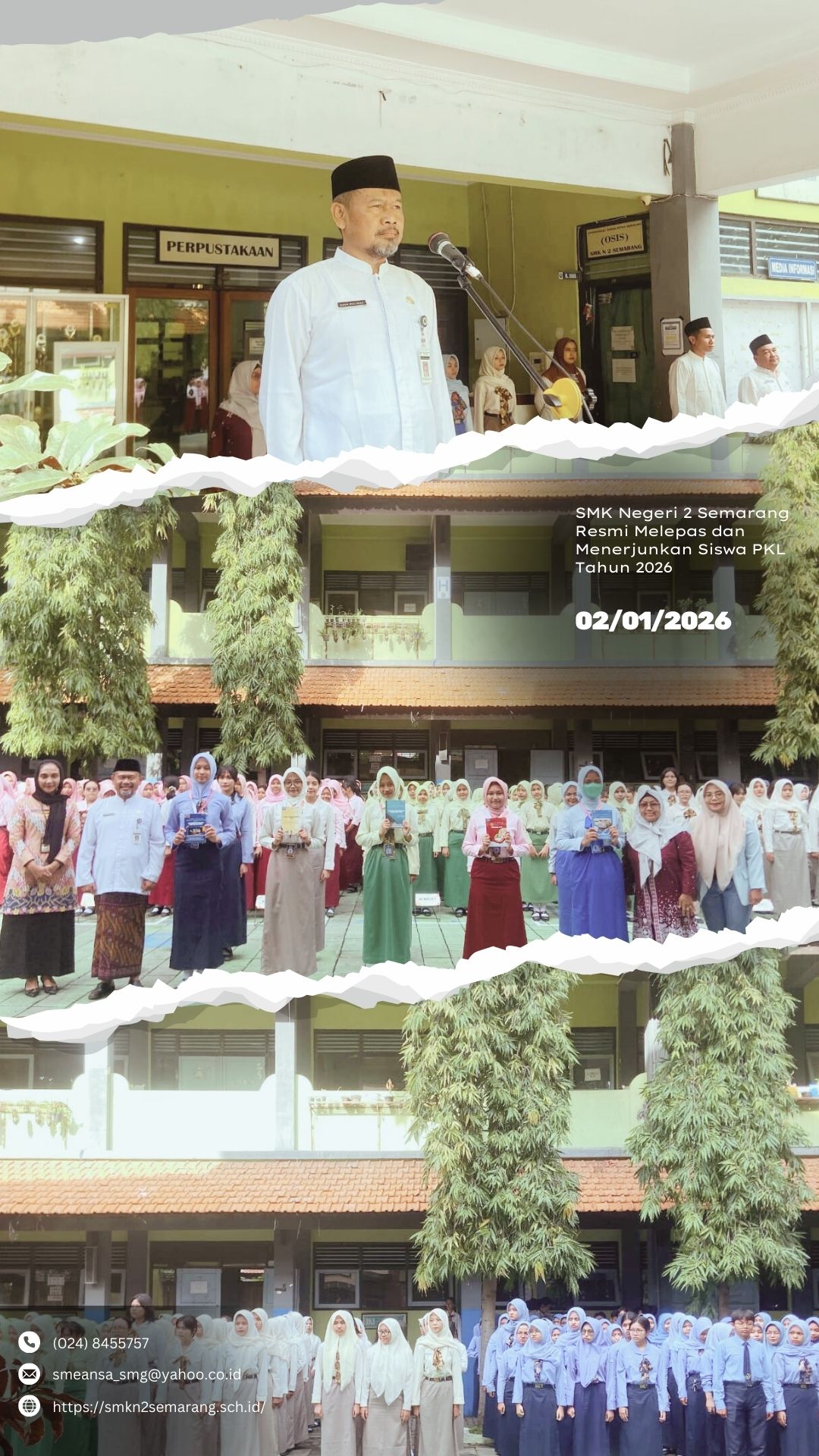 Semarang – SMK Negeri 2 Semarang melaksanakan Apel Pagi dalam rangka Penarikan Siswa Praktik Kerja Lapangan (PKL) Tahun 2025 sekaligus Penerjunan Siswa PKL Tahun 2026 pada Jumat, 2 Januari 2026, bertempat di lapangan utama sekolah. Kegiatan ini diikuti oleh ratusan siswa Kelas XI serta dihadiri oleh jajaran pimpinan sekolah, panitia PKL, mitra industri, dan perwakilan Komite Sekolah.